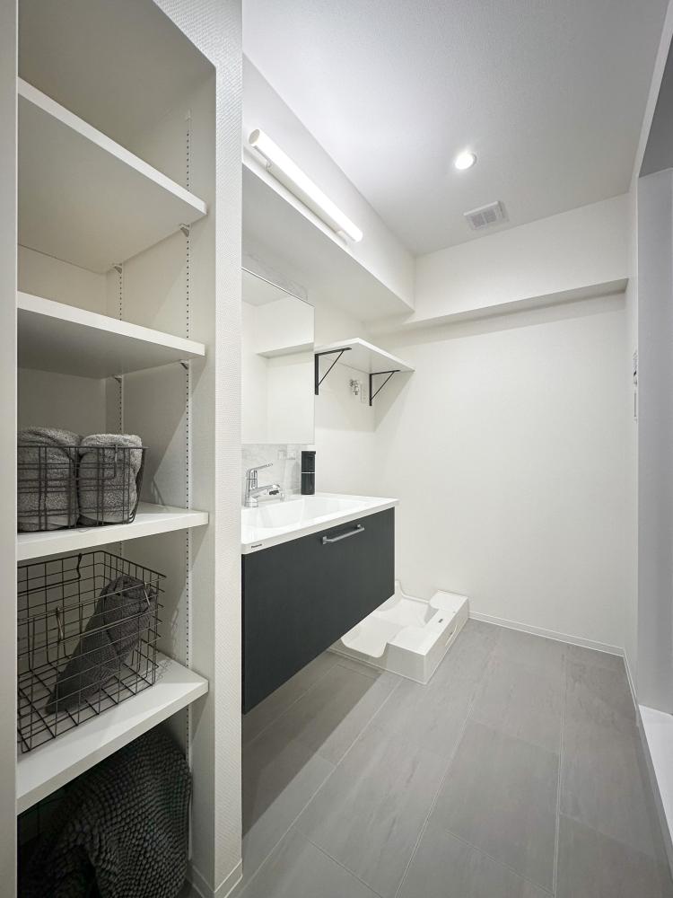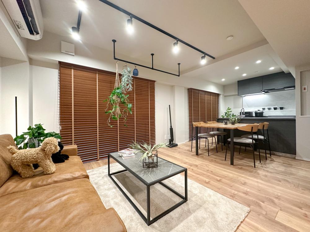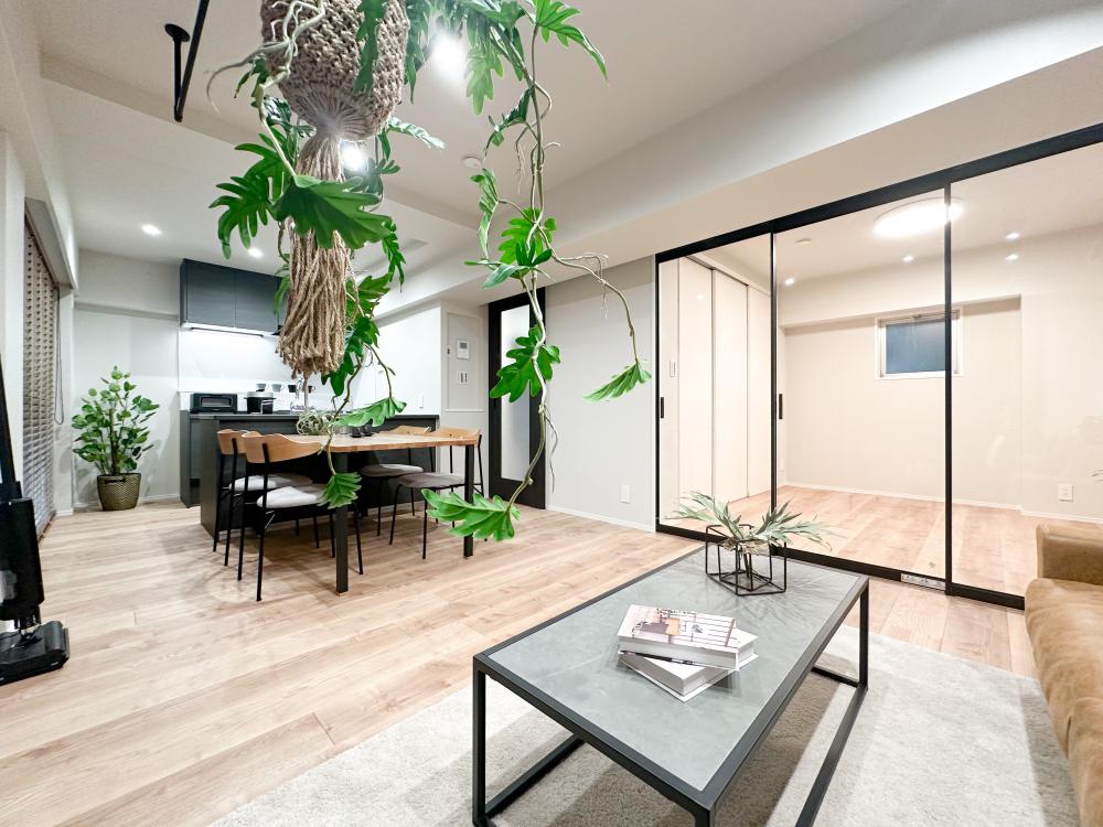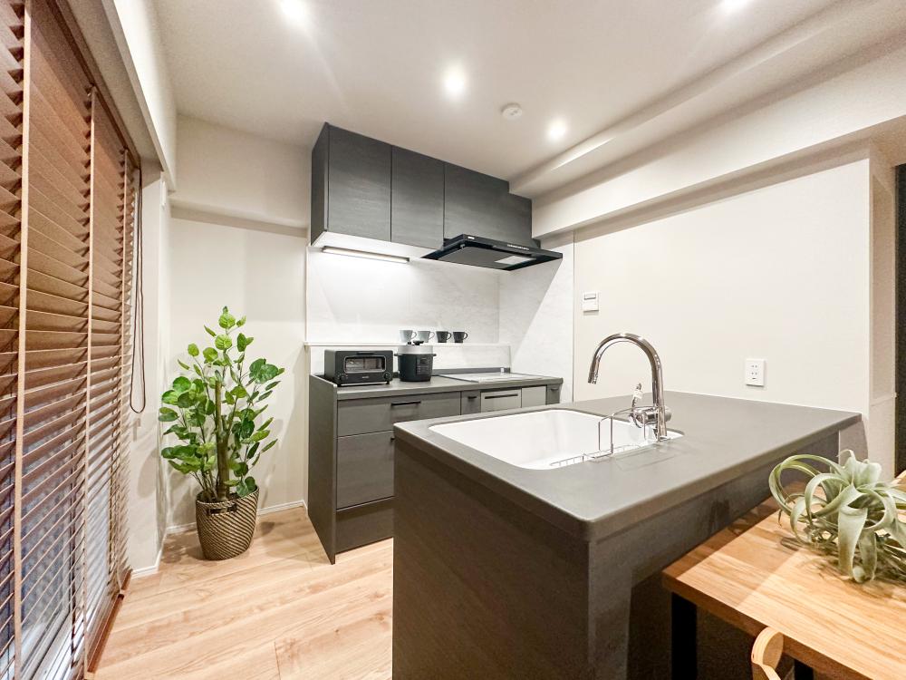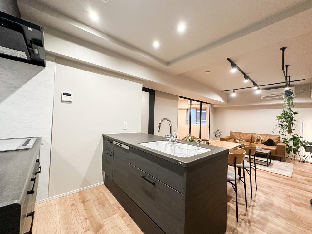 内装は全体的にシングル&DINKsを想定し、シンプルかつ温かみのある木目とモノトーンの内装で仕上げています。キッチンも2面のオープンで色目をダークな物を採用することでリビングから見ても違和感のないデザインに仕上げています。居室との間を仕切る引き戸は透明なドアを使用しLDKとのつながりを感じるお部屋となっています。
