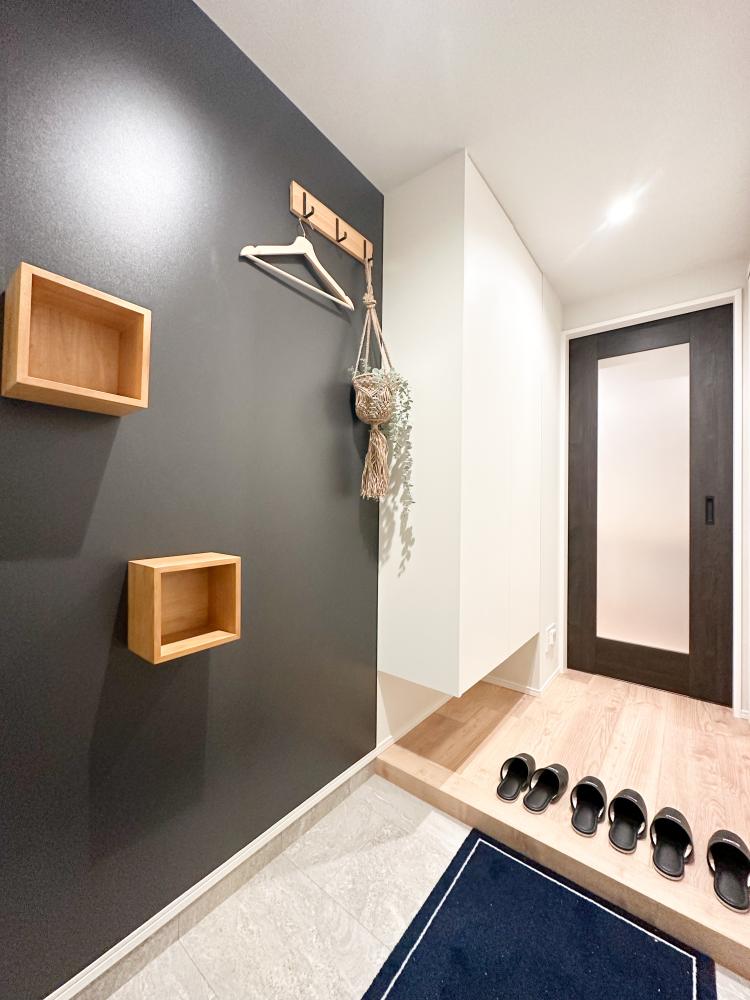 地上階のお部屋なので玄関は自転車やアウトドア用品を置きやすい少し広めの土間を作り、マグネットパネルを壁に採用して自由に使える便利な空間を作りました。