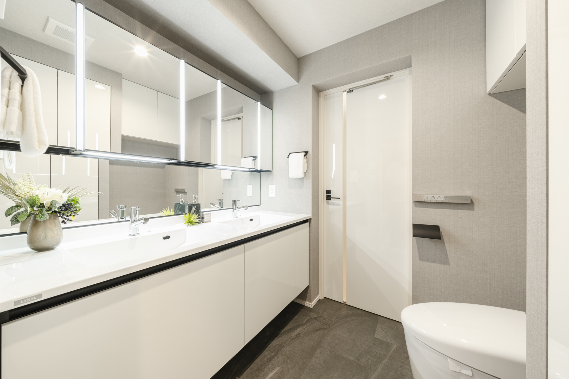 空間を広く優雅に使うため、ゆとりのあるダブルボウルの洗面台を採用しました。その他にも、5面ミラーや石目調の上質な床材を取り入れることで、まるでホテルのような空間を作り出しています。