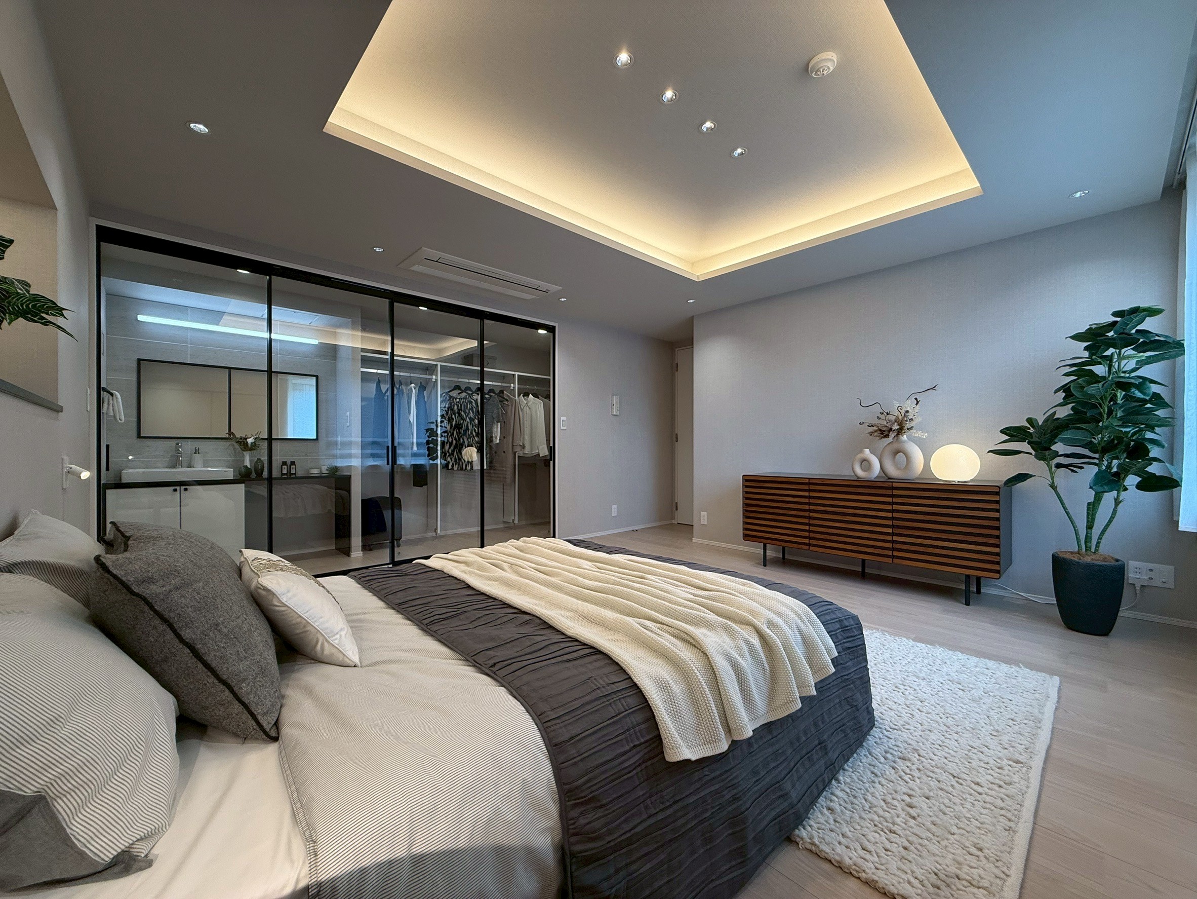 実際の暮らしにおいて、非日常感を味わえるよう、機能性とディテールへの徹底的なこだわりを形にしました。ベッドルームから続く洗面室付きのウォークインクローゼットは、あえてガラス張りにすることで、空間の奥行きと広がりを強調しています。