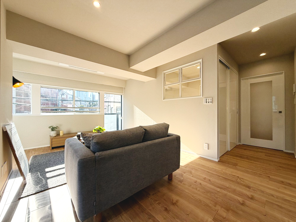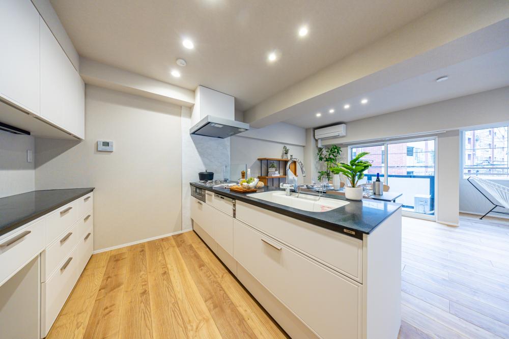 マンション内でも専有面積の広い角部屋という特権を活かし、二面採光から入る光がリビングの隅々まで届くよう設計しました。かつては壁付けのキッチンや和室で細かく仕切られていた空間を、仕切り壁の位置から見直すことで、広々とした開放感あふれるLDKへと大胆に変更しています。