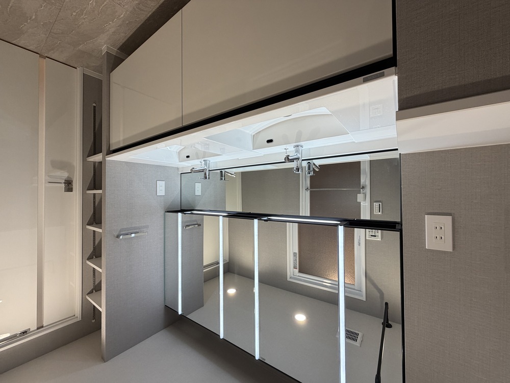 洗面室には、高級感の漂うダブルボウルの洗面台を採用しています。家族で準備が重なる時間帯でも気兼ねなく身支度を整えられる仕様です。