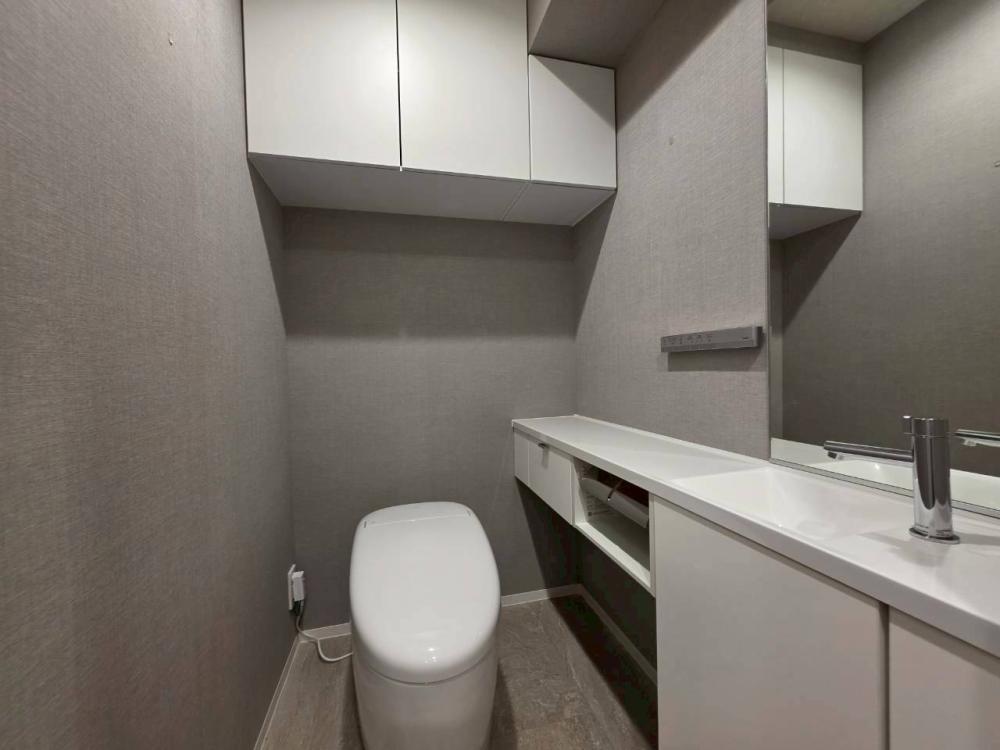 カウンターには美しさとメンテナンス性を兼ね備えた人工大理石を使用し、さらに五面鏡の裏側には大容量の収納を確保しました。